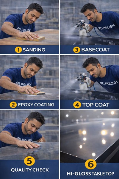 For PU polish and PU paint, we use professional spray application methods to deliver a glass like smooth finish with high durability and resistance.